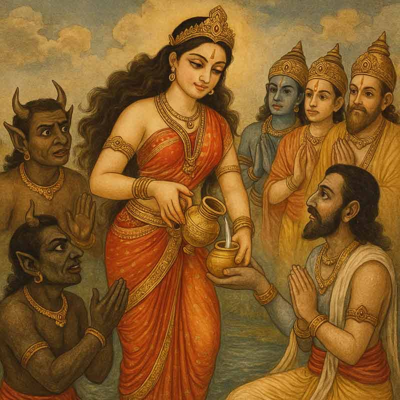 - राहु का वध (Slaying of Rahu): "छित्वा राहुग्रीवां" - जब राहु ने छल से अमृत पिया, तो मोहिनी रूप में भगवान ने अपने सुदर्शन चक्र से उसका सिर काट दिया।