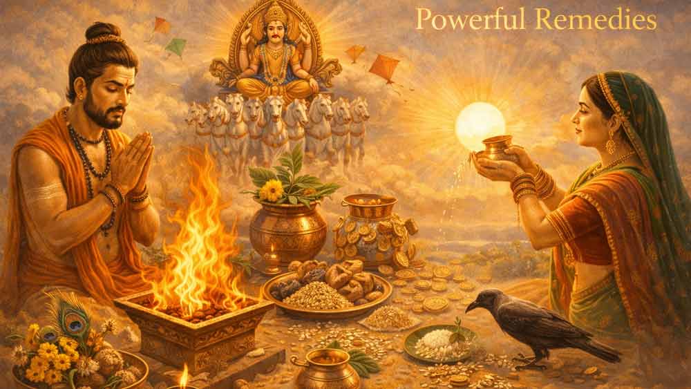 उत्तर: सूर्य को गुड़, लाल फूल और लाल चंदन मिलाकर अर्घ्य दें और 'ओम सूर्याय नमः' का जाप करें। साथ ही गरीबों को उड़द दाल की खिचड़ी खिलाएं।