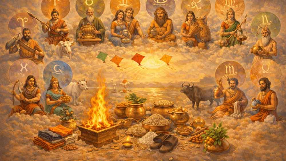 जब सूर्य साक्षात् अपने पुत्र शनि के घर (मकर राशि) में पधारते हैं, तो ग्रहों की स्थिति बहुत शक्तिशाली होती है। ऐसे में अपनी राशि के स्वामी ग्रह को प्रसन्न करने वाली वस्तुओं का दान करने से दुर्भाग्य सौभाग्य में बदल सकता है।