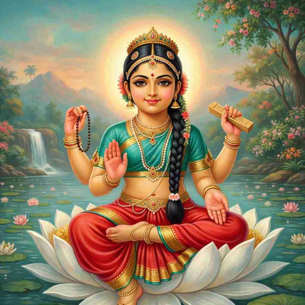 3. षोडशी/ललिता (श्लोक 4): बालार्क के समान तेज, मंद स्मित, पाश-धनुष-बाण धारिणी, पद्मासन पर विराजमान। "बालां स्वयं षोडशीम्" — बाला स्वयं षोडशी हैं।