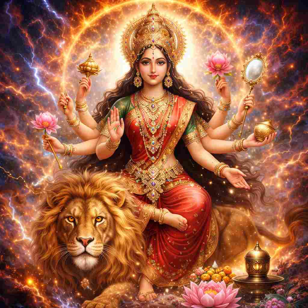 2. त्रिदेवों की आराध्या: ब्रह्मा (सृष्टि), विष्णु (पालन) और रुद्र (संहार) — ये तीनों अपनी शक्तियाँ (सरस्वती, लक्ष्मी, गौरी) माँ से ही प्राप्त करते हैं। स्वतंत्र रूप से ये कुछ नहीं कर सकते।
