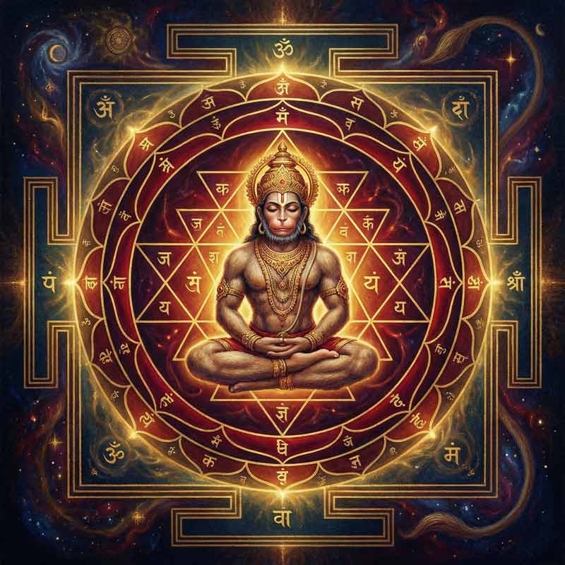 - सुबह स्नान के बाद, हनुमान जी के यन्त्रोधारक स्वरूप (एक षट्कोण यंत्र के भीतर ध्यान मुद्रा में बैठे हुए) का ध्यान करते हुए पाठ आरम्भ करें।